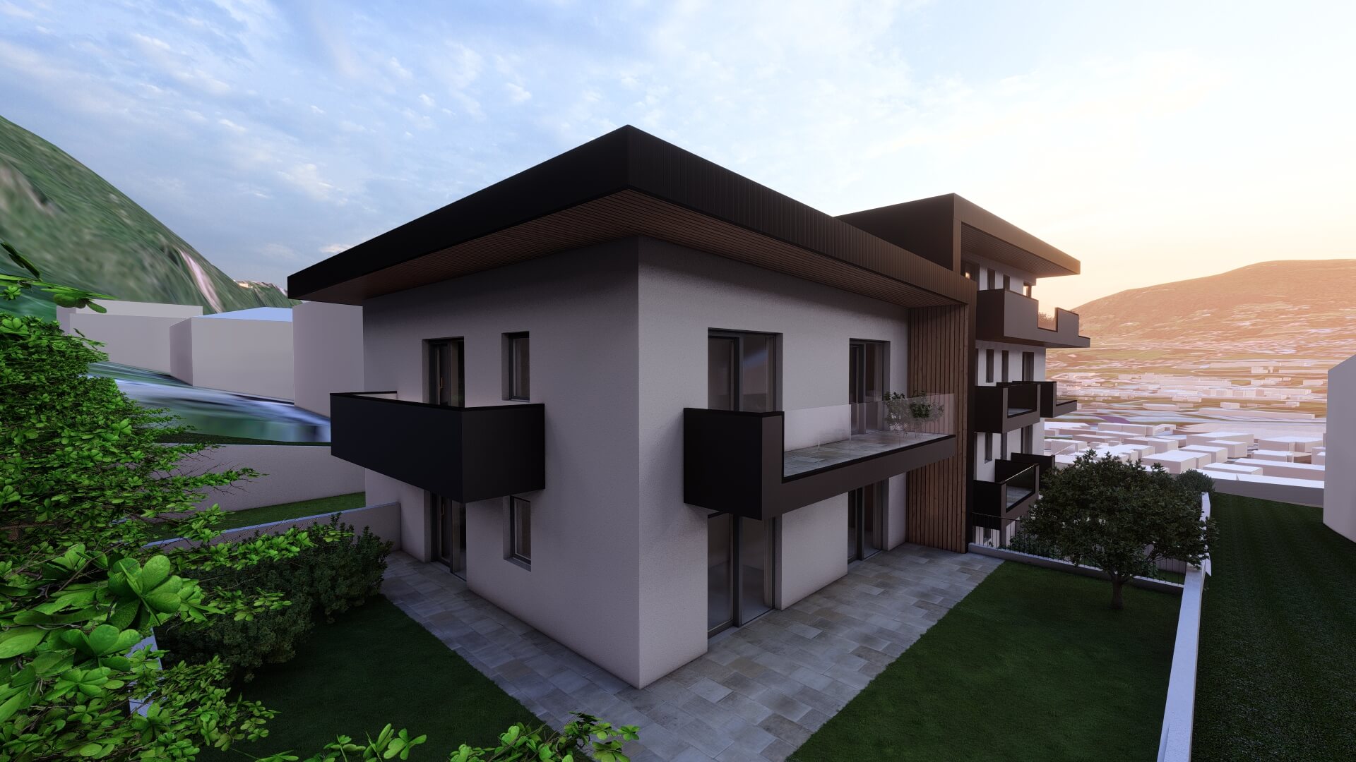 Il lotto di progetto presentava un grande dislivello tra la strada superiore e quella inferiore, pertanto, la progettazione ha necessariamente dovuto tenere conto di questo aspetto, sviluppando un progetto che seguisse l’andamento naturale del terreno. Per questo motivo, l’abitazione risulta come due blocchi distinti ed incollati tra di loro, aventi rispettivamente due e quattro piani. I materiali utilizzati e le finiture degli stessi hanno portato alla realizzazione di un progetto dalle linee razionali e moderne. L’accesso all’abitazione avviene dal fronte principale. La collocazione di pannelli solari sulla copertura permetterà di contenere i consumi energetici dei sei appartamenti.