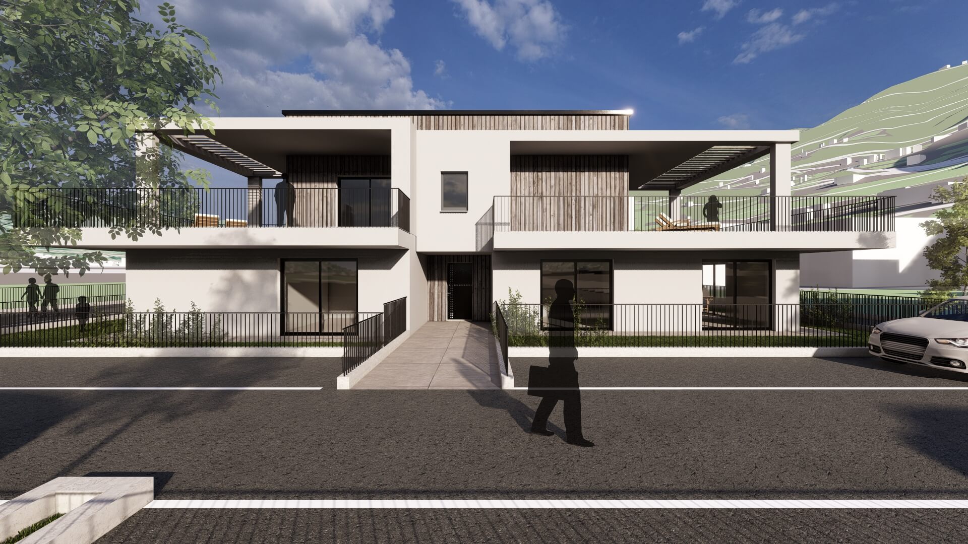 Il progetto, posto al confine dell’abitato di Vela (TN) in prossimità dei campi agricoli è disposto su due piani con ampi giardini al piano terra e terrazze di notevoli dimensioni al piano superiore. Un progetto che permette di avere un rapporto interno/esterno forte, dove dalle vetrate è possibile ammirare il paesaggio circostante dei campi e sullo sfondo le montagne. L’abitazione sarà servita da un parcheggio scoperto comodo. Sulla copertura piana saranno installati pannelli solari che permetteranno di ottenere un risparmio dei consumi energetici della residenza. I materiali utilizzati nel progetto permettono di conferire un carattere moderno ma allo stesso tempo rurale alla palazzina.